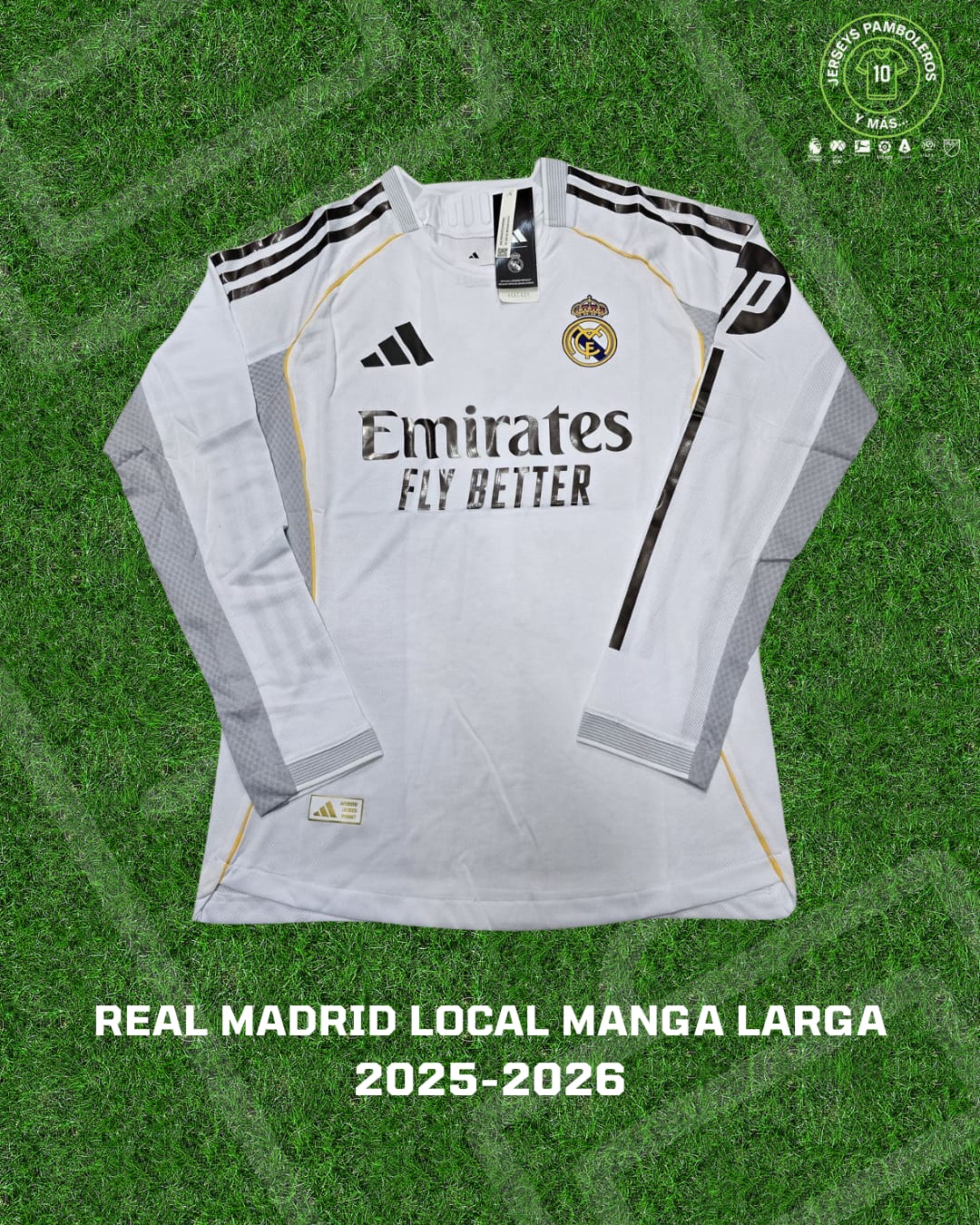 Jersey Real Madrid Local Manga Larga 25-26 Tallas S-XXL Versión jugador Personaliza con tipografía y parche de LaLiga, Copa del Rey y Champions. 🚚 Envíos a todo México. El costo y tiempo de entrega se calculan en el checkout.