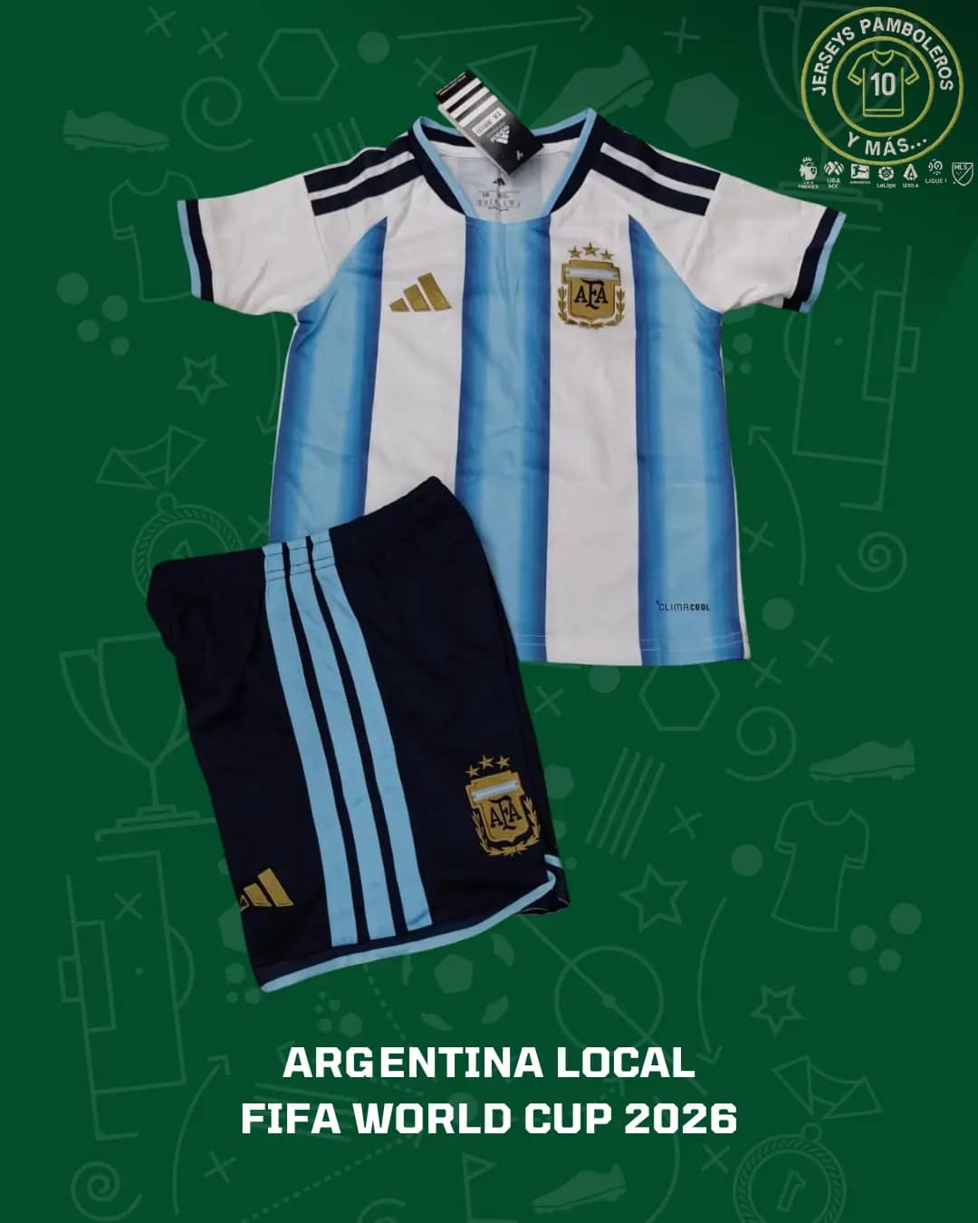 Argentina local Mundial 2026 niño (Incluye short y playera). Tallas 4-14. Personaliza con tipografía original. 🚚 Envíos a todo México. El costo y tiempo de entrega se calculan en el checkout.
