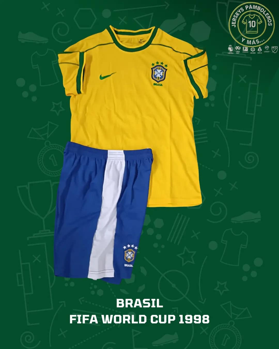 Brasil 1998 niño (Incluye short y playera). Tallas 4-14. Personaliza con tipografía original. 🚚 Envíos a todo México. El costo y tiempo de entrega se calculan en el checkout.