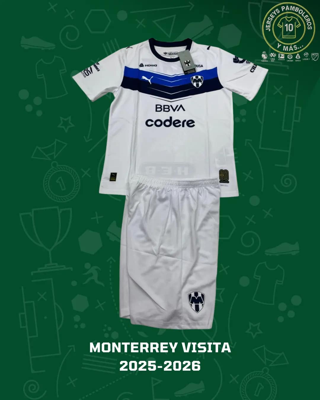 Rayados 2025-26 visita niño (Incluye short y playera). Tallas 4-14. Personaliza con tipografía original. 🚚 Envíos a todo México. El costo y tiempo de entrega se calculan en el checkout.