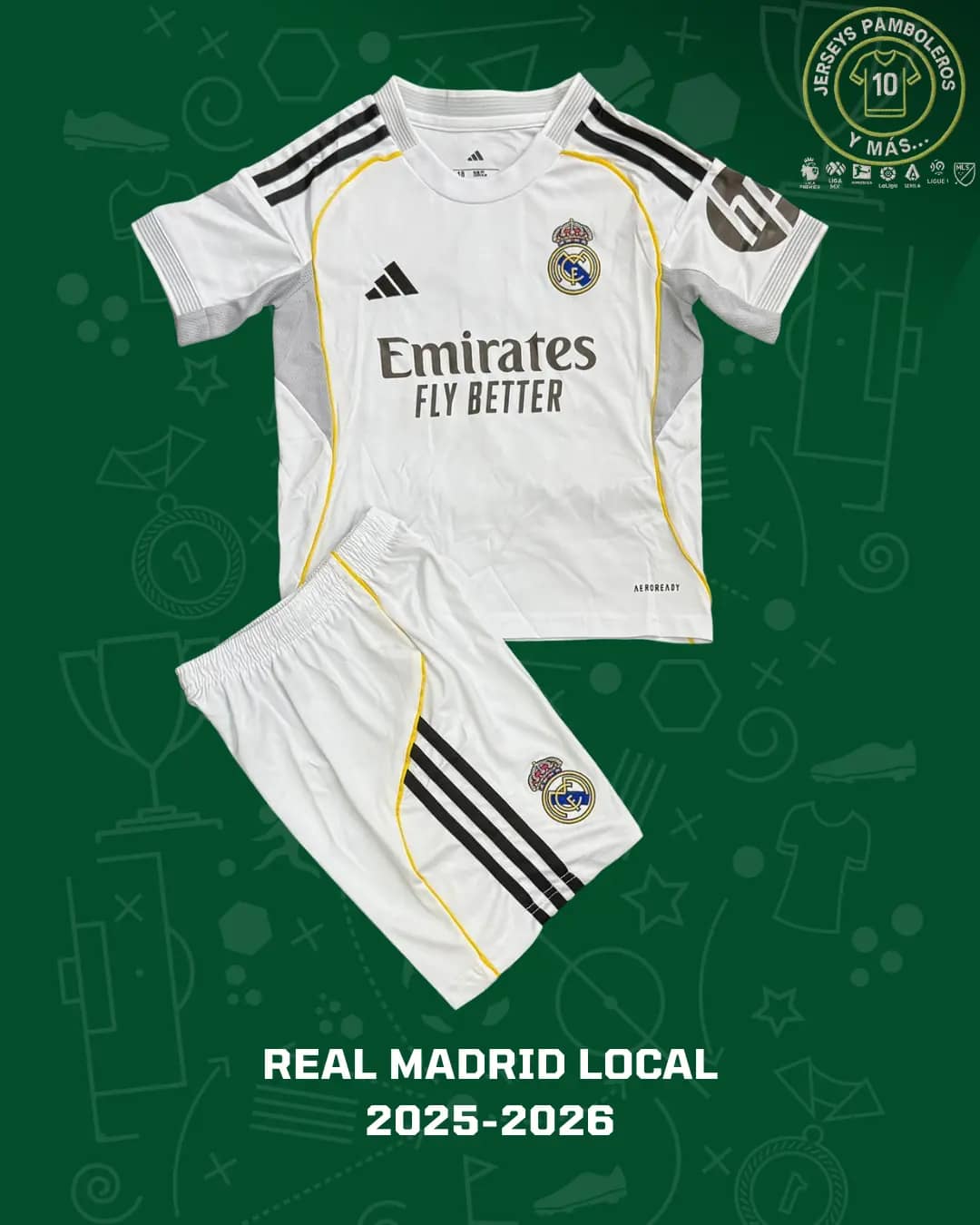 Real Madrid local 2025-26 niño (Incluye short y playera). Tallas 4-14. Personaliza con tipografía original. 🚚 Envíos a todo México. El costo y tiempo de entrega se calculan en el checkout.