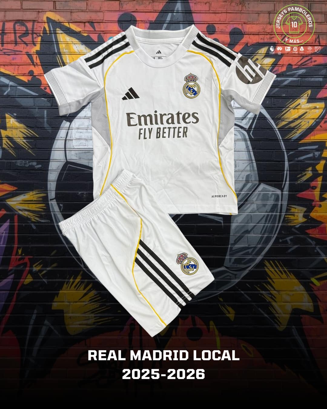 Real Madrid local 2025-26 Tallas S-XL Incluye short, medias y playera con nombre y número con tipografía original. 🚚 Envíos a todo México. El costo y tiempo de entrega se calculan en el checkout.